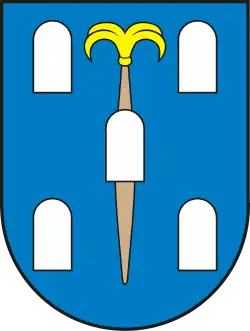 Em campo de vermelho, uma mitra dourada, uma roda de azenha em tenné com oito pás e uma torre em prata.[2] |