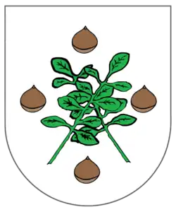 Sobre escudo redondo de prata, dois ramos cruzados de purgueira e quatro castanhas dispostas em cruz.[2] |