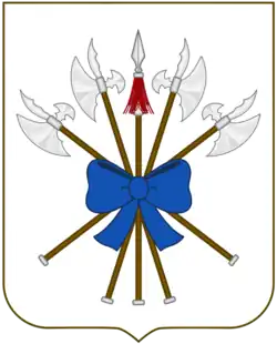 Feixe de quatro alabardas de prata e uma lança de ouro, amarradas com uma fita azul |