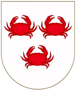 Em escudo redondo de prata, três caranguejos (aratus) dispostos em roquete. |