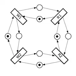 A seguinte rede de Petri demonstra o funcionamento dum buffer duplo. As transições W1 e W2 representam a escrita nos buffers 1 e 2 respectivamente, enquanto R1 e R2 representam a leitura do buffers 1 e 2. No início somente a transição W1 está habilitada, e após ser realizada, tanto R1 e R2 estão habilitadas e podem ser processadas em paralelo. Quando terminam, R2 e W1 procedem em paralelo e assim por diante.
