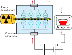 As câmaras de ionização medem as cargas depositadas pela partícula carregada ao atravessar o meio ionizado que tanto pode ser um gás como um líquido ou mesmo um sólido, cada um tendo as suas vantagens e as suas aplicações.[1]