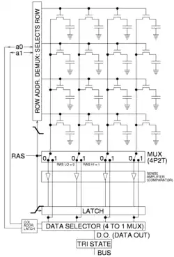 A memória estática de acesso aleatório (SRAM) normalmente possui células de seis transistores, enquanto a memória dinâmica de acesso aleatório (DRAM) normalmente possui células de transistor único.[15][13] Em 1965, a calculadora eletrônica Toscal BC-1411 da Toshiba usou uma forma de memória dinâmica de acesso aleatório (DRAM) bipolar capacitiva, armazenando dados de 180 bits em células de memória discretas, consistindo de transistores e capacitores bipolares de germânio.[16][17] A tecnologia de metal-óxido-semicondutor (MOS) é a base para a memória dinâmica de acesso aleatório (DRAM) moderna. Em 1966, o Dr. Robert H. Dennard no centro de pesquisa Thomas J. Watson da IBM estava trabalhando na memória de metal-óxido-semicondutor (MOS). Ao examinar as características da tecnologia de metal-óxido-semicondutor (MOS), ele descobriu que era capaz de construir capacitores e que armazenar uma carga ou nenhuma carga no capacitor de metal-óxido-semicondutor (MOS) poderia representar o 1 e o 0 de um bit, enquanto o transistor de metal-óxido-semicondutor (MOS) poderia controlar a escrita da carga no capacitor de metal-óxido-semicondutor (MOS). Isso levou ao desenvolvimento de uma célula de memória de memória dinâmica de acesso aleatório (DRAM) de transistor único.[18] Em 1967, Dennard registrou uma patente para uma célula de memória de memória dinâmica de acesso aleatório (DRAM) de transistor único, baseada na tecnologia de metal-óxido-semicondutor (MOS).[19]
