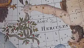 A cauda da constelação de Cérbero estava em Fornax (representado[3] como um aparelho químico[4]). Aparentemente, o "ramo dourado" em que a serpente Cérbero se enrosca, o "ramo da árvore das maçãs de ouro" buscada pelo titã Atlas do Jardim das Hespérides[5] foi considerado como tendo sido gerado por meio da alquimia. O tal ramo dourado era conhecido como a constelação de Ramus Pomifer.