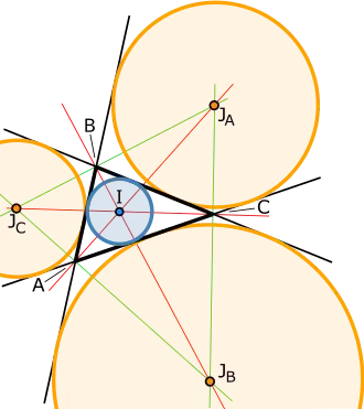 Um triângulo (em preto) com o círculo inscrito (em azul), incentro (I), círculos exinscritos (em laranja), exincentros (JA,JB,JC), bissetrizes internas (em vermelho) bissetrizes dos ângulos externos (em verde)