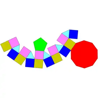 | Faces | 5 triângulos 15 quadrados 1 pentágono 1 decágono |
