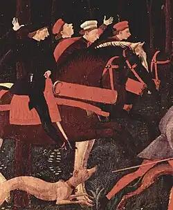 A Caçada é um exemplo precoce do uso efetivo da perspectiva na arte da Renascença, com os participantes da caçada, incluindo pessoas, cavalos, cães e cervos, desaparecendo na distância no meio da floresta escura. Foi a última pintura conhecida de Uccello antes da sua morte em 1475.