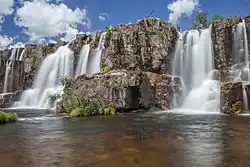 Abastecida pelas águas do rio dos Couros, despenca de cerca de 100 metros de altura em inúmeras menores cachoeiras. As quedas são muito bonitas, e também muito perigosas, especialmente na época das chuvas (outubro a março).