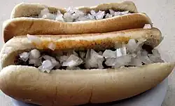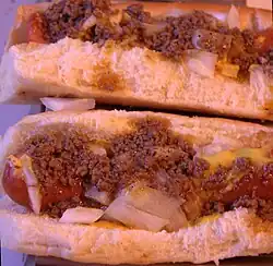 | Ingrediente(s) principal(is) | Salsicha Wiener, ou uma salsicha Viena de carne bovina ou bovina e suína de estilo europeu com tripa de cordeiro ou ovelha, coberta com um molho de carne feito de carne moída temperada ou coração de boi, coberto com mostarda amarela, cebola branca e, às vezes, queijo. |