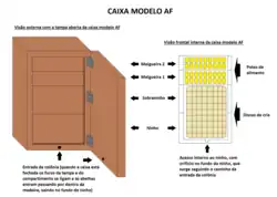 <ref>inválida; não foi fornecido texto para as "refs" nomeadas:4 - ↑ a b c d e f g h «Modelos de Caixas para Abelhas sem Ferrão - Caixas INPA e AF». Criar Abelhas. 6 de setembro de 2017. Consultado em 14 de agosto de 2020