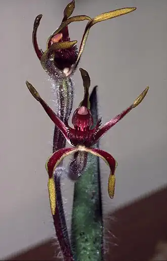 São plantas com uma única folha basal pubescente com marcas proeminentes púrpura perto da base, e uma inflorescência rija, fina e densamente pubescente, com uma ou poucas flores, que vagamente lembram uma aranha, muito estreitas, caudadas, e bem esparramadas, normalmente pendentes. Em conjunto formam grupo bem vistoso quando sua floração é estimulada por incêndios de verão.[2]