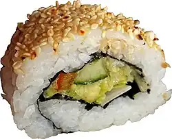Coloque a folha de alga sobre a esteira de bambu e distribua por cima uma camada de arroz por toda a extensão da alga. Polvilhe com gergelim. Vire a alga para cima, deixando o arroz em contato com a esteira. Espalhe a maionese sobre a alga, coloque a alface, a manga, o pepino e o kani cortado ao meio. Enrole o sushi com o auxílio da esteira, pressionando levemente para fixar bem o conteúdo. Com uma faca bem afiada corte o sushi em 6-8 porções.