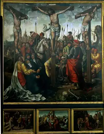 No painel maior está representada a Crucificação de Cristo entre as crucificações do Bom e o Mau ladrão, estando a Virgem Maria desfalecida a ser amparada por Maria Madalena, São João e uma santa mulher. À volta dos crucificados está uma multidão de guardas e carrascos, três deles a cavalo, num espectáculo de expressivo dramatismo, a que acresce a meia distância do lado esquerdo a cena do transporte da escada, e mais longe, do lado direito, o enforcamento de Judas.[1]