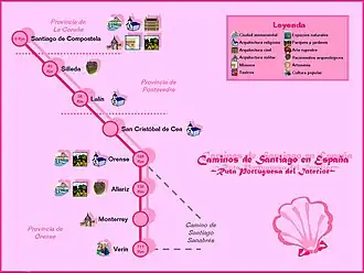 Para muitos autores, o percurso do Caminho de Santiago entre Ourense e Santiago de Compostela faz também parte do Caminho Sanabrês. Por este percurso, os peregrinos provenientes de Portugal entram na Galiza por Verín, situada 15 km a norte da fronteira de Chaves.