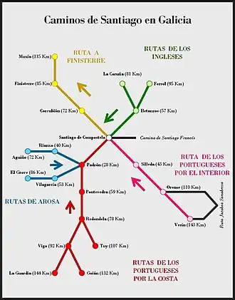 No início a entrada em território galego era sempre feita por Tui, situada na margem do rio Minho oposta a Valença, pois só ali existia uma ponte sobre o rio. Com a construção da ponte de Vila Nova de Cerveira-Goián e da criação do serviço de ferryboats entre Caminha e A Guarda, estas localidades passaram também a ser usadas pelos peregrinos como ponto de entrada na Galiza