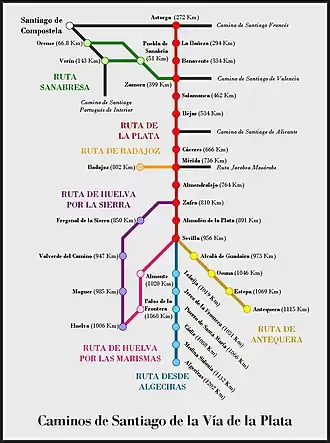 No território espanhol, todas estes percursos estão devidamente assinalados e estão dotados de infraestruturas para os peregrinos, nomeadamente trilhos e albergues.