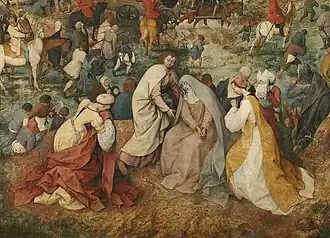 Mais de 150 personagens integram a composição, quase todas vestidas com roupas contemporâneas do pintor para atualizar o drama cristão, como havia já feito, por exemplo, Jan van Eyck. Os verdadeiros protagonistas do quadro não são os fatos evangélicos, mas o teatro natural da multidão e a paisagem. No enxame de formas, são exceção o grupo em primeiro plano à direita das mulheres piedosas e São João que confortam Maria. Esta última figura é copiada do desenho dos primitivos flamengos do século precedente, fazendo eco deliberadamente das formas um pouco arcaicas de Rogier van der Weyden e Hugo van der Goes.