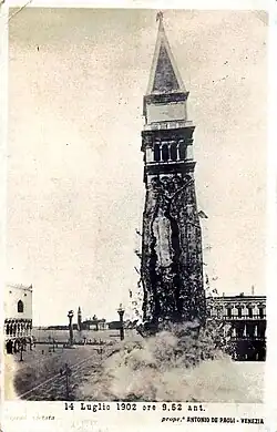 Em julho de 1902, sobre a parede norte da construção, foi descoberta uma perigosa fenda que nos dias seguintes aumentou de tal modo que na manhã de segunda-feira 14 de julho às 9h47 o campanário se desmoronou. Não houve vítimas e, dada a posição da torre, os danos foram limitados em extensão. Durante a tarde o conselho comunal, reunido de urgência, decidiu a reconstrução com 500 000 liras para contribuir para os trabalhos. O sindicalista Filippo Grimani durante o discurso na ocasião da colocação da primeira pedra, em 25 de abril de 1903, pronunciou a famosa frase dov'era e com'era (onde estava e como era) que se converteu no lema da reconstrução. Os trabalhos duraram até 6 de março de 1912. O novo campanário foi inaugurado em 25 de abril de 1912 por ocasião da festa de São Marcos.[1]