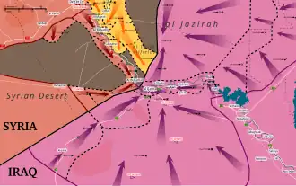 A 5 de novembro, as forças governamentais efectuaram fortes avanços chegando a 15 quilómetros da cidade[32], e alcançando a Fronteira Iraque-Síria[33]. Após o Exército Sírio se terem ligado a grupos das Forças de Mobilização Popular na fronteira em 8 de novembro[34], o EAS e aliados lançaram um assalto contra Abu Kamal[35], rapidamente cercando a cidade[36]. No dia seguinte, as forças governamentais capturaram Abu Kamal mas, no dia seguinte, o Estado Islâmico retomou partes da cidade após um contra-ataque[37]. Em 11 de novembro, a cidade foi totalmente recapturada pelo EI[38].
