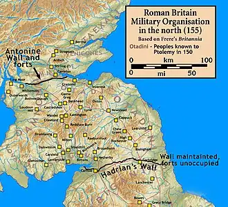 ![]() Mapa da região entre a Muralha de Adriano e a Muralha Antonina, construída por Lólio Úrbico durante esta campanha. | |||