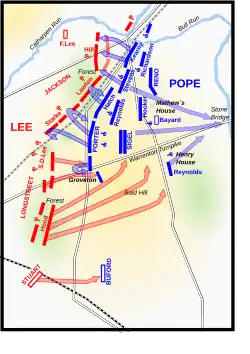 A batalha mais importante da campanha, Segunda Bull Run (Segunda Manassas), foi travada em 28-30 de agosto.[20] A fim de atrair o exército de Pope para a batalha, Jackson ordenou um ataque a uma coluna federal que estava passando à sua frente em Warrenton Turnpike, em 28 de agosto. O combate em Brawner's Farm durou várias horas e resultou em um impasse.