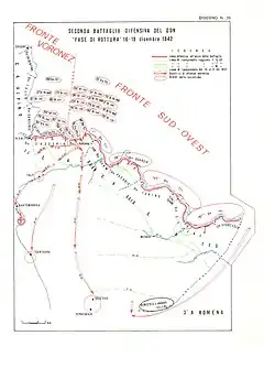 Em meio à extrema confusão, destacaram-se atos de bravura e heroísmo entre as tropas, mas as deficiências estruturais do Exército Real (falta de equipamentos, veículos motorizados e familiaridade com o combate em retirada), unidas às condições ambientais extremas, em geral anularam os episódios mais marcantes e, em momentos críticos, a coesão muitas vezes falhou.[106] Como não existia um plano pré-estabelecido para a retirada, a artilharia foi abandonada, a infantaria recuou a pé e não foi dizimada pelas unidades blindadas soviéticas apenas porque o Stavka e os oficiais superiores, tendo compreendido as vantagens das manobras em profundidade, preocuparam-se exclusivamente em lançar nas retaguardas os grupos mecanizados, limitando-se a hostilizar as indefesas colunas italianas.[107] No dia 19, os soviéticos alcançaram Kantemirovka, um dos centros logísticos do 8.º Exército, e Chertkovo: desse modo, o Exército Vermelho conseguiu penetrar profundamente atrás do XXXV Corpo e do XXIX. Korps, interrompendo assim a importante ligação ferroviária entre Millerovo e Rossosh'. Quando, dois dias depois, os soviéticos se reagruparam em Degtevo com as vanguardas blindadas do 3.º Exército de Guardas vindas do setor do grupo Hollidt, quatro divisões italianas e uma alemã já estavam cercadas;[108] na realidade, já no dia 19 havia chegado a ordem para tentar estabelecer uma posição defensiva ou no Tikhaya ou no Chir, mas essas tropas não haviam conseguido mover-se com rapidez suficiente e não restou outra solução senão tentar sair do cerco e alcançar o mais rápido possível as linhas alemãs. O que restava das unidades dos dois corpos de exército dividiu-se em duas colunas: o bloco norte era constituído sobretudo por unidades das divisões "Ravenna", "Pasubio" e "Torino", bem como pela 298. Infanterie-Division e por um punhado de veículos blindados reunidos no "grupo Hoffmann"; o bloco sul contava com homens das divisões "Pasubio", "Sforzesca" e "Celere", além da brigada SS "Schuldt". Durante a marcha, as colunas, desordenadas e exaustas, tiveram de defender-se dos contínuos ataques das unidades soviéticas e partidárias. O Exército Vermelho usou suas formações blindadas para atacar os aeroportos estratégicos de Tatsinskaya e Morozovsk, de onde partiam os aviões de transporte da Luftwaffe que abasteciam precariamente o 6.º Exército cercado em Stalingrado, razão pela qual atribuiu a algumas divisões de fuzileiros a tarefa de atacar e destruir as colunas ítalo-alemãs, que estavam abrindo um caminho incerto na estepe em pleno inverno. O bloco norte foi de fato cercado pela 35.ª Divisão de fuzileiros de Guardas e correu o risco de ser completamente aniquilado de 21 a 25 de dezembro de 1942, durante a batalha de Arbuzovka: conseguiu romper as linhas inimigas, mas ao custo de mais de 20 000 mortos, feridos e prisioneiros.[109]