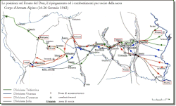 A Operação Pequeno Saturno não afetou o Corpo Alpino, mas expôs seu flanco direito, à medida que os dois exércitos soviéticos avançavam para o sul.[114] O sucesso obtido permitiu ao Stavka continuar as operações em janeiro de 1943, estendendo pouco a pouco a ofensiva até incluir os Grupos de Exércitos Centro, Dom e A: essa nova série de manobras iniciou-se com ataques direcionados às unidades húngaras e alemãs posicionadas na defesa do curso médio do Dom e às unidades germano-romenas que tentavam obstinadamente defender Rostov, por onde o Grupo de Exércitos A deveria recuar do Cáucaso.[115] O objetivo soviético era derrotar as unidades inimigas e assumir o controle da linha ferroviária Svoboda-Kantemirovka, avançando depois para oeste até a linha Urazovo-Alekseievka-Repevka.[113] Entre 13 e 27 de janeiro, o 40.º Exército da Frente de Voronezh e o 6.º e 3.º Exércitos Blindados da Frente Sudoeste conduziram a ofensiva Ostrogozhsk-Rossosh, provocando a destruição do 2.º Exército húngaro, posicionado à esquerda do Corpo Alpino.[115] Já no primeiro dia, as forças húngaras cederam de forma esmagadora, no dia 14 as formações soviéticas romperam as posições do XXIV. Panzerkorps, que se encontrava mais ao norte, e no dia 15 alcançaram Rossosh, o quartel-general do Corpo Alpino; inicialmente repelidos, os soldados soviéticos retomaram a cidade no dia seguinte.[114] Nos primeiros dias da ofensiva, o Corpo Alpino manteve suas posições, reforçado pela 156.ª Divisão "Vicenza", e a 3.ª Divisão "Julia" conseguiu junto com algumas unidades heterogêneas do XXIV Corpo blindado manter uma linha defensiva improvisada ao sudoeste do rio Kalitva; no entanto, em meados do mês, as divisões soviéticas também atacaram as tropas alpinas. Os estados-maiores ítalo-alemães não perceberam imediatamente a extensão do avanço e demoraram a intervir, de modo que só na noite do dia 17 as unidades receberam ordens para recuar, quando já as divisões "Tridentina", "Julia", "Cuneense" e "Vicenza", juntamente com a 385.ª e 387.ª Divisões de infantaria (pertencentes ao XXIV. Panzerkorps), o grupo Waffen-SS "Fegelein" e a modesta 27.ª Divisão blindada, já estavam cercadas.[116]