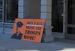 - ↑ Kitch, Michael (22 de novembro de 2011). «Anti-war Ron Paul attracting support from local left» [Ron Paul anti-guerra atrai apoio da esquerda local]. Laconia Daily Sun. Consultado em 29 de julho de 2025. Cópia arquivada em 25 de novembro de 2011