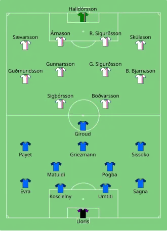 - ↑ «França termina sonho islandês». UEFA. 3 de julho de 2016. Consultado em 3 de julho de 2016