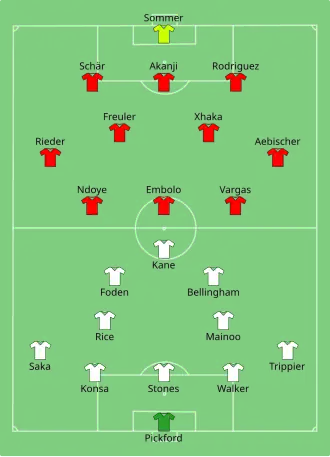 - ↑ a b «Tactical Line-ups – England v Switzerland» (PDF). UEFA.com. Union of European Football Associations. 6 de julho de 2024. Consultado em 6 de julho de 2024