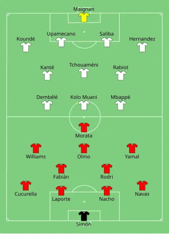 - ↑ a b «Tactical Line-ups – Spain v France» (PDF). UEFA.com. Union of European Football Associations. 9 de Julho de 2024. Consultado em 9 Julho 2024