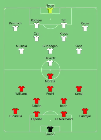 - ↑ a b «Tactical Line-ups – Spain v Germany» (PDF). UEFA.com. Union of European Football Associations. 5 de Julho de 2024. Consultado em 5 de Julho de 2024