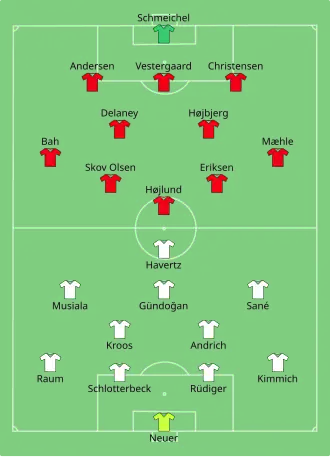 - ↑ a b «Tactical Line-ups – Germany v Denmark» (PDF). UEFA.com. Union of European Football Associations. 29 de Junho de 2024. Consultado em 29 de Junho de 2024