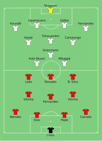- ↑ a b «Tactical Line-ups – Portugal v France» (PDF). UEFA.com. Union of European Football Associations. 5 de Julho de 2024. Consultado em 5 de Julho de 2024