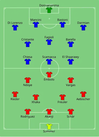 - ↑ a b «Tactical Line-ups – Switzerland v Italy» (PDF). UEFA.com. Union of European Football Associations. 29 de Junho de 2024. Consultado em 29 de Junho de 2024