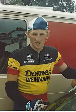 Wilfried Nelissen com o maillot de campeão da Bélgica, durante a disputa de um sprint na Vuelta a Andalucía 1995.