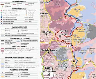 - ↑ «New checkpoint opened at entrance to Shuafat» [Novo posto de controle aberto na entrada de Shuafat]. The Jerusalem Post. Dezembro de 2011. Consultado em 24 de outubro de 2025. Cópia arquivada em 13 de dezembro de 2011