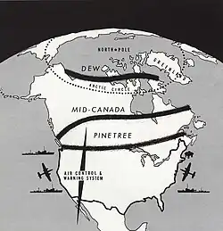 Em 1951, a Linha Pinetree foi estabelecida ao norte da fronteira Canadá-Estados Unidos, e em 1953 o Canadá construiu Mid-Canada Air Warning Line, que foi ocupada pelo exército Canadense.[15] Em 1954, a Linha Distant Early Warning (DEW) foi criada em conjunto pelos Estados Unidos e o Canadá, no Ártico.[16] A Linha Pinetree foi construída para controlar a batalha aérea entre as forças interceptadoras do NORAD e bombardeiros Soviéticos. Começando com o Ground-controlled interception atualizados desde a Segunda Guerra Mundial, o sistema foi informatizado e automatizado, com pelo menos quatro novas gerações de tecnologia. Ficou claro, até mesmo nos primeiros anos da Guerra Fria, que, no papel, o Canadá e os Estados Unidos estavam a ser co-responsáveis pela defesa do continente. Na execução, o investimento Canadense em defesa aérea diminuiu significativamente com o declínio da ameaça de bombardeiro estratégico intercontinental. Na década de 50 o RCAF contribuiu com 14 esquadrões de interceptores CF-100 e esta foi reduzida para apenas 3 esquadrões de CF-101 em 1970. Parte disso é devido à melhoria da tecnologia, mas é mais devido ao declínio da ameaça de bombardeiro e as reduções nos gastos militares Canadenses.