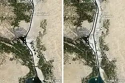 Imagem de satélite do canal de Suez antes e depois da expansão de 2015