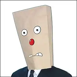 Em uma entrevista ao Wall Street Journal,[5] Otário Anonymous afirmou que preza pelo seu anonimato, porque protege sua capacidade de falar abertamente e permite que os telespectadores possam se relacionar com ele. Além de colocar um saco de papel na cabeça, ele usa um terno com luvas brancas para ocultar sua etnia e idade e prefere não revelar seu nível de instrução, sua voz também é alterada para um tom mais aguda.[3][14]