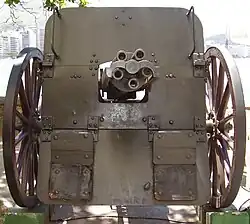 O canhão giratório Hotchkiss de uma libra tinha cinco canos de 37 mm e era capaz de disparar 68 tiros por minuto com uma precisão de alcance de 2.000 jardas (1.800 m). Cada carregador de alimentação continha dez tiros e pesava aproximadamente 18 libras (8 kg). Além da versão para uso em campo, havia várias outras versões do canhão giratório Hotchkiss de 37 mm, incluindo versões para defesa naval contra barcos torpedeiros e versões de fortaleza que disparavam projéteis de metralha ou destruição para a defesa de fossos. A versão naval foi adotada pela Rússia e pelos Estados Unidos, entre outros. A versão de canhão de campo era acompanhada por um veículo de suprimentos puxado por cavalos, que continha 110 tiros mais seis carregadores carregados, totalizando 170 tiros.[2] Um exemplar está exposto no Museu de História do Exército Brasileiro no Forte de Copacabana, Rio de Janeiro.[3][4]
