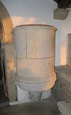 O alpendre é suportado por oito colunas de fuste liso e capitéis de tipo dórico que, por sua vez, se apoiam sobre um muro de pedra. Adossado ao lado esquerdo da porta de entrada, está um púlpito de pedra de forma circular.