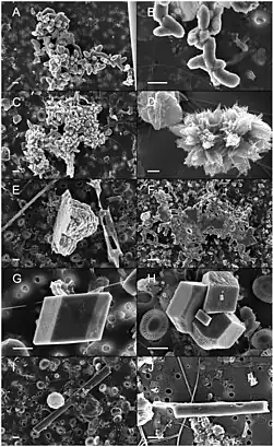 B) e D) Partículas semelhantes aos carbonatos de Ca descritos como precipitados na superfície celular de bactérias marinhas [en] cultivadas.