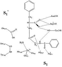 O sitio ativo da enzima conhecido como S1 e S1' (Fig.1) é o locus da catalise. O S1' é um local essencialmente hidrofóbico e possui um grupo Tyr-248 como uma “capa” para esse local um vez que o substrato for ligado esse local é um dos principais responsáveis pela preferência de cadeias aromáticas e alifáticas.[5][3] Uma interação que foi relatada de grande importância para a catálise consiste na interação do grupo Arg- 127 que interagem em conjunto com o ácido carboxílico terminal e o oxigênio da cadeia peptídica que está coordenada ao zinco.[3]