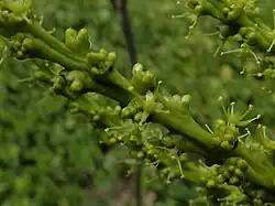 É uma planta dioica, com indivíduos machos e fêmeas. Sua inflorescência masculina é um racemo terminal com pequenas flores esverdeadas de 2,5 a 3,5 mm de diâmetro. Nem as flores masculinas nem as femininas possuem pétalas. A inflorescência feminina é uma espiga terminal, também com flores esverdeadas de 2,5 a 3,5 mm de diâmetro, contendo brácteas grandes e persistentes.[2]