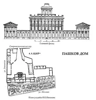 Três pórticos da fachada estão localizados de frente. A Casa Pashkov é uma amostra rara na arquitetura global, onde três pórticos são usados para esse arranjo de fachadas, que são absolutamente semelhantes pelas suas principais dimensões e número de colunas. Somente a ordem usada é diferente.