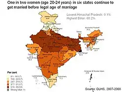 Segundo o censo nacional da Índia em 2011, a idade média do casamento entre mulheres é de 21,2 anos.[34][35] Na faixa etária de 15 a 19 anos, 69,6% de todas as mulheres pesquisadas na Índia nunca foram casadas.[36]