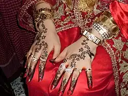 - ↑ As joias da noiva cobrem-lhe a cabeça, o peito, as mãos e os antebraços, além duma braceletes grossas nos tornozelos, os kholkhal.