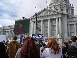 - ↑ a b «Loudly and colorfully, opposing sides debate Proposition 8» [Em alto e bom som, os lados opostos debatem a Proposta 8]. Los Angeles Times (em inglês). 6 de março de 2009. Consultado em 18 de fevereiro de 2025