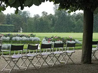 - O palácio é acedido por dois terraços que o elevam. O primeiro terraço é delimitado por um talude em inclinação, o segundo por um muro de sustentação. Na base dos degraus, estendem-se os parterres. São seguidos por dois tanques que separam quatro longas peças de relvado, interrompidas por um redondo onde está um grupo de esculturas. Todas essas peças são apoiadas por quinas verdes [sic] ornadas de figuras e de dois pequenos bosques divididos em Cruz de Santo André. Um outro bosquete, acima, forma uma grande sala longa acompanhada de cinco claustros ou estrelas, ornados nos seus centros por figuras e vasos. Ao aproximar-se do palácio, apercebem-se duas salas sendo uma em boulingrin e a outra dividida por sete peças de relvado, ambas rodeadas por árvores isoladas.